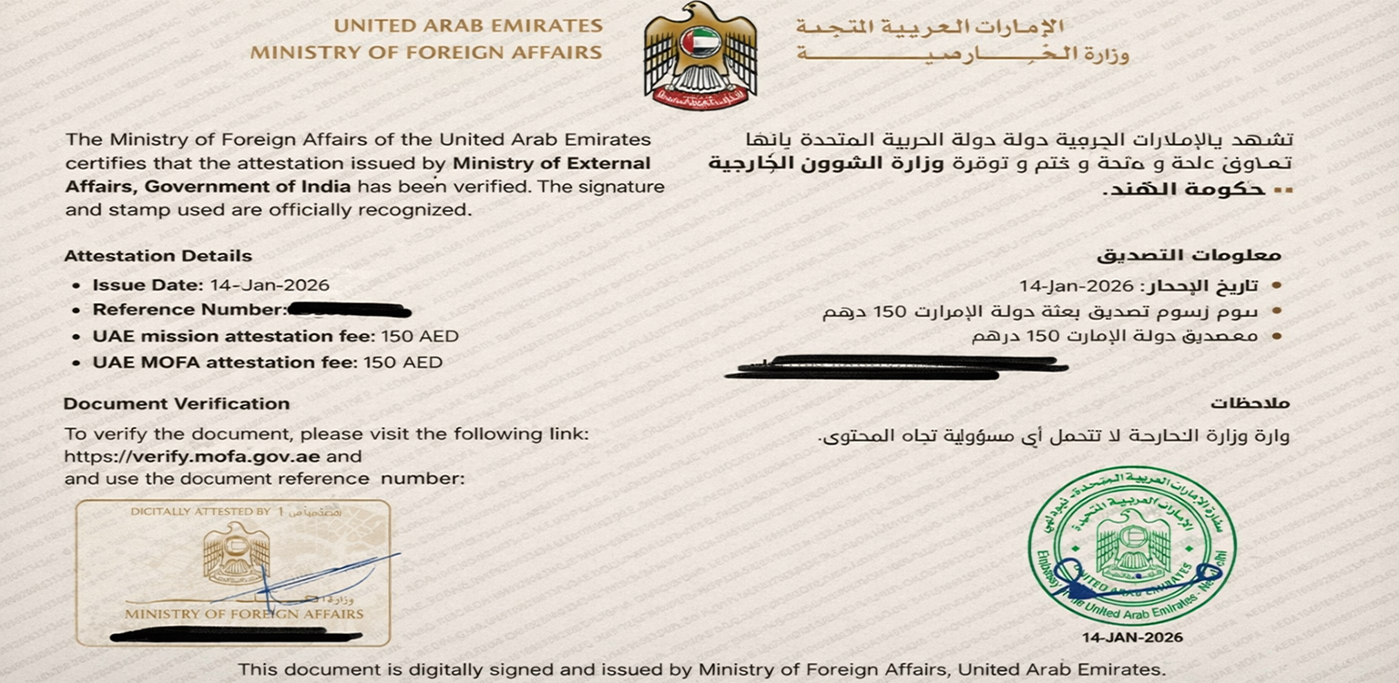Yes, under the latest digital process (2025), UAE Embassy & MOFA attestation is combined in one single-window digital step in Delhi, India — no need to send to UAE.